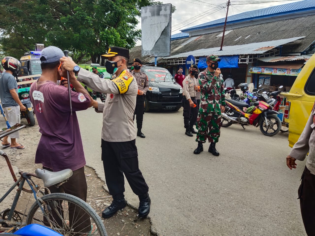 Pada kesempatan tersebut, pihaknya juga berbagi masker gratis kepada masyarakat. Nampak personil gabungan TNI-POLRI yang dilibatkan bergantian memberikan himbauan dan berbagi masker untuk menekan penyebaran Covid-19.