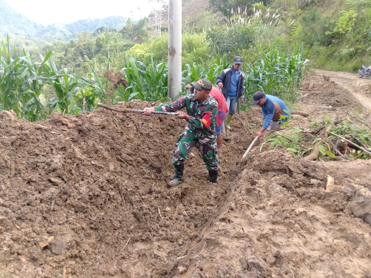 MAMASA – Praka Langgeng Pribadi anggota Babinsa Koramil 1428-03/Mambi Kodim 1428/Mamasa memotivasi masyarakat binaannya khususnya di Desa Saluahok Kec. Mahelaan Kab. Mamasa untuk melakukan Karya Bhakti pasca bencana tanah longsor yg mengakibatkan material longsor menutupi badan jalan sehingga jalur transportasi Keppe-Mehalaan tidak dapat dilewati oleh kendaraan. Rabu (22/03/2023)