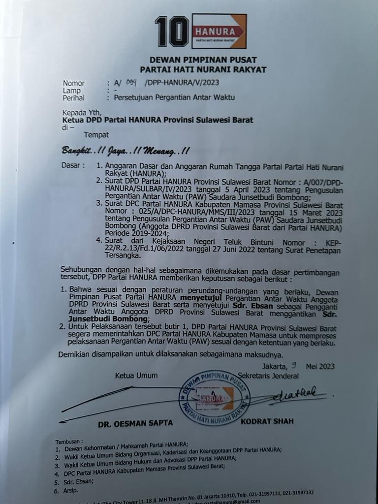 Surat dengan Nomor A/094/DPP-HANURA/V/2023 yang diteken langsung oleh Ketua DPP Partai Hanura, Oesman Sapta, berisi persetujuan DPP Partai Hanura terkait usulan nama pengganti antar waktu anggota DPRD Provinsi Sulbar Junsetbudi Bombong oleh Ebsan.
