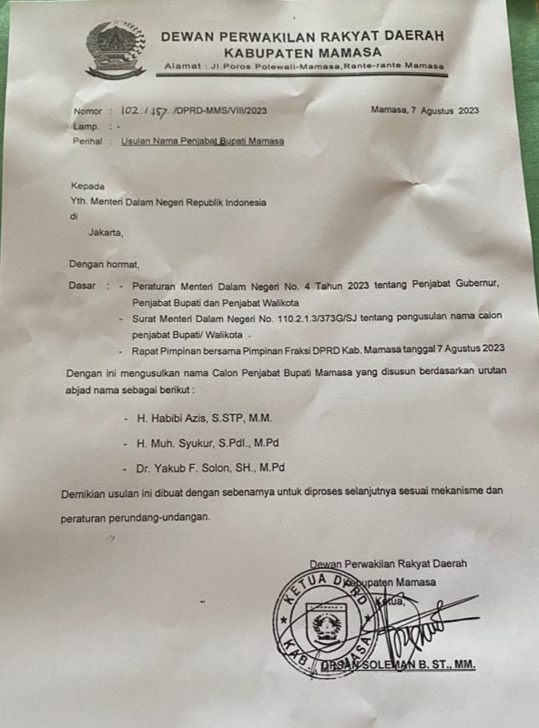 Surat rekomendasi DPRD Kabupaten Mamasa terkait usulan nama calon Pj. Bupati Mamasa. Foto: duk pena.