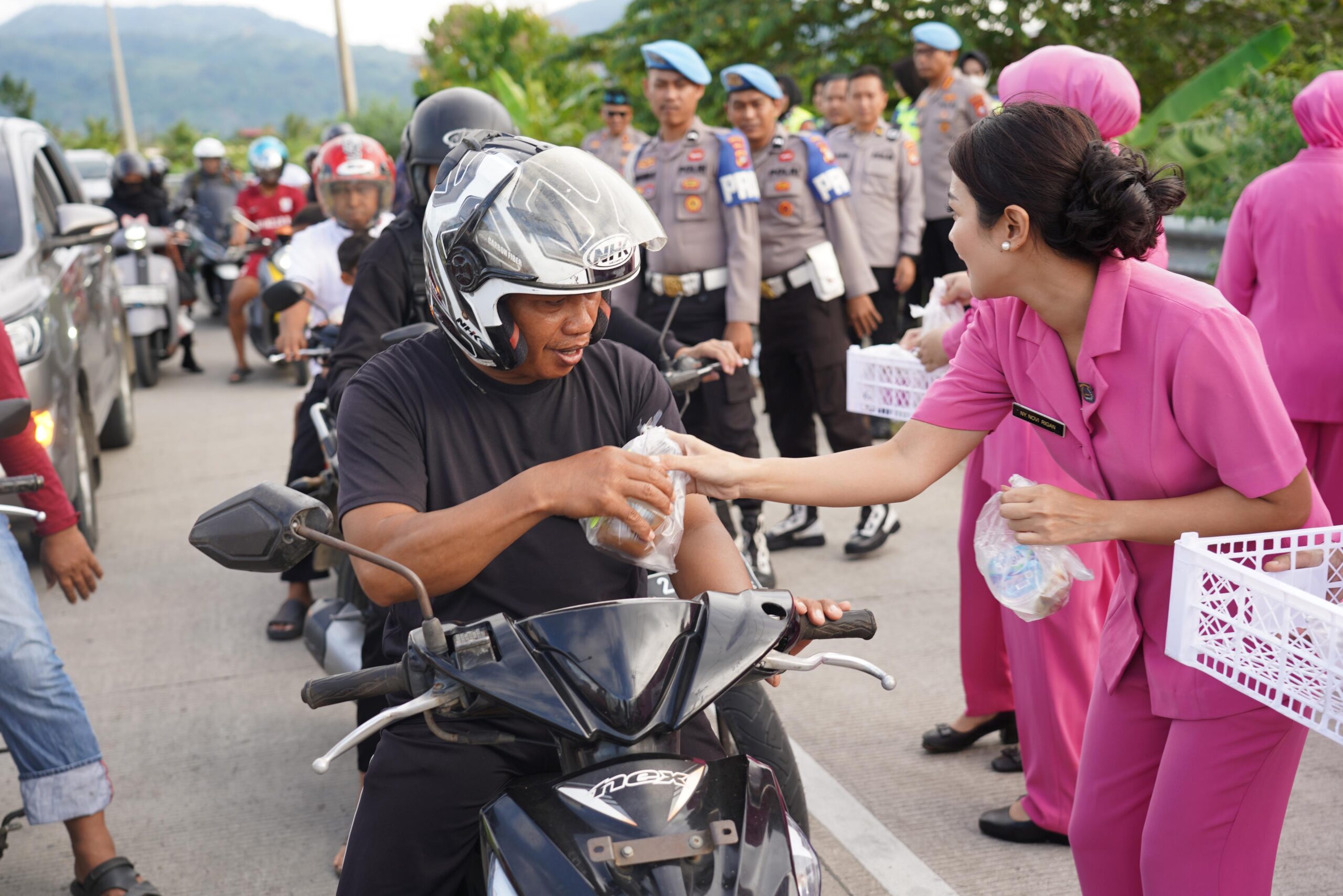 “Ini pak/ibu, kakak/adik ada sedikit makanan dan minuman untuk berbuka, diterima ya semoga bermanfaat,” tutur para personel dan Bhayangkari dengan penuh keramahan saat memberikan takjil.