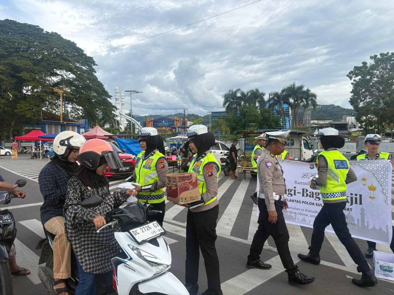 Kegiatan ini berlangsung di dua lokasi strategis, yaitu Bundaran Arteri Mamuju dan Pos Patroli Jalan Raya (PJR) Ditlantas Polda Sulawesi Barat, dengan tujuan menjangkau kepada para pengendara dan masyarakat yang melintas saat menjelang waktu berbuka puasa.