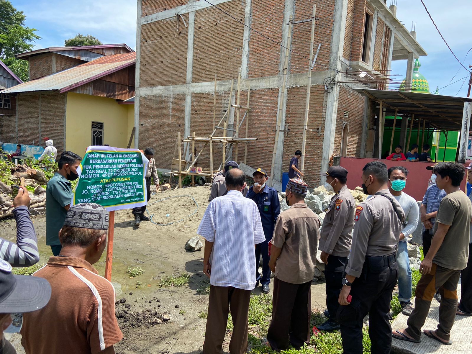 Pembacaan hasil Putusan pelaksanaan Eksekusi oleh Panitera PN. Polewali sekaligus sebagai juruh sita Arman, SH didampingi oleh Panitera pengganti PN. Polewali Muh Saleh, SH dan Staf PN. Polewali sebagai saksi Hamzah, SH serta dihadiri Kepala Desa Karama Ahmad Madanrang, Pemohon Eksekusi Nur Irbat Wahab, S.Ag ( Suami Pemohon eksekusi Hasmiaty Tahar ) dan Termohon eksekusi Masni, dkk serta disaksikan oleh Kl 30 orang Masyarakat sekitar.