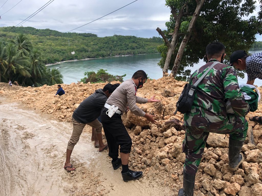 Selain personil lalu lintas dan masyarakat yang bergotong royong memulihkan akses jalan dengan membersihkan material longsor berupa lumpur menggunakan alat seadanya, Bhabinsa setempat juga datang membantu.