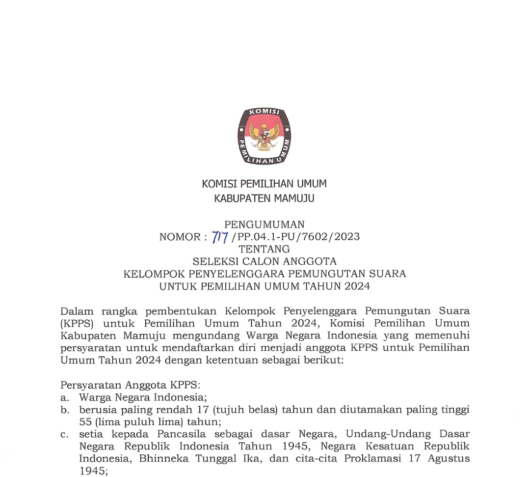 Mamuju, penasulbar.co.id – Dalam rangka pembentukan anggota Kelompok Penyelenggara Pemungutan Suara (KPPS) pada Pemilu 2024, KPU Kabupaten Mamuju membuka rekrutmen dengan sejumlah persyaratan yang harus dipenuhi.