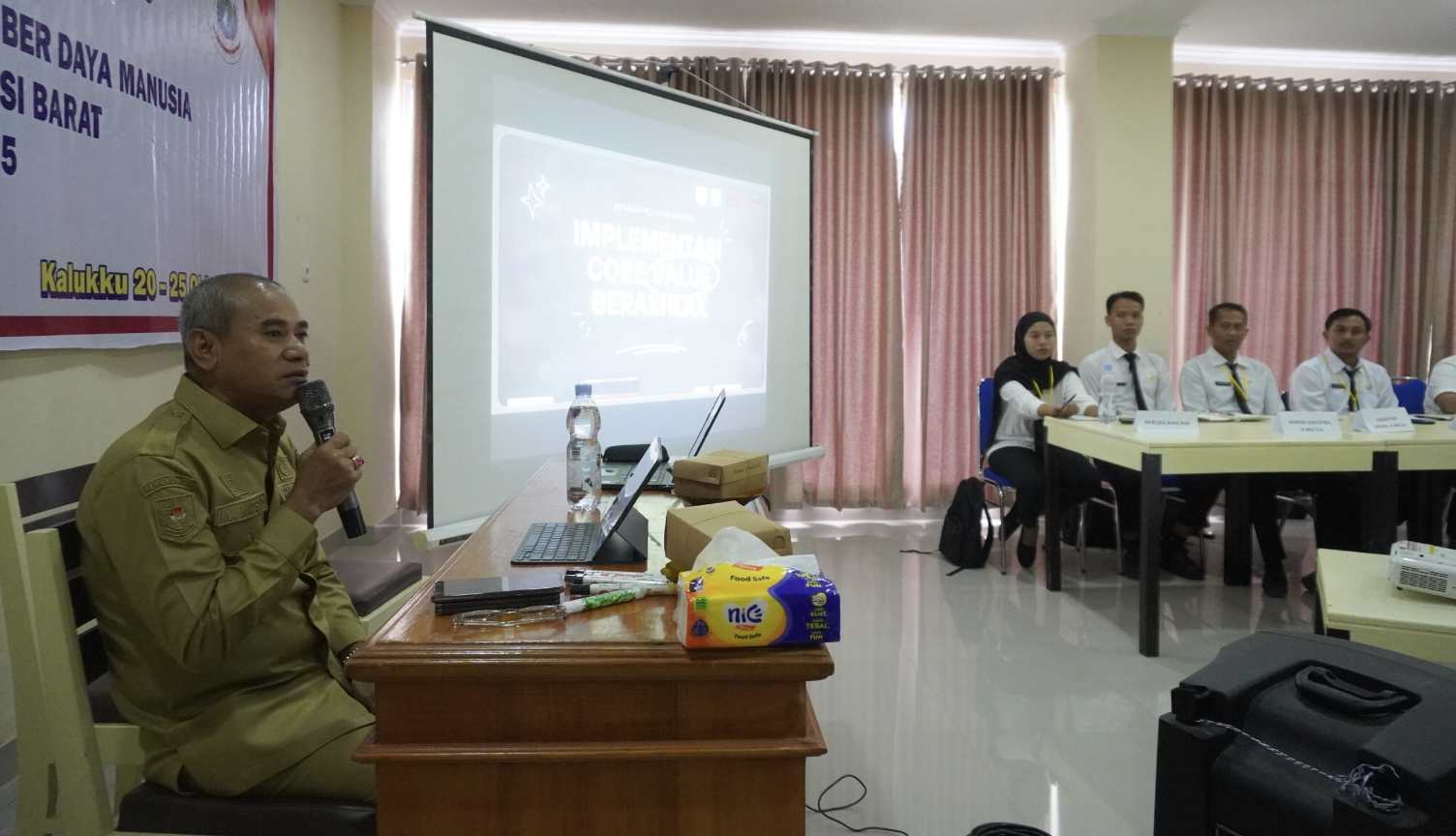 Mamuju,penasulbar.com – Inspektur Daerah Provinsi Sulawesi Barat, M. Natsir, menjadi narasumber dalam kegiatan Pelatihan Dasar (Latsar) Calon Pegawai Negeri Sipil (CPNS) Kabupaten Pasangkayu yang diselenggarakan atas kerja sama Pemerintah Kabupaten Pasangkayu dan Badan Pengembangan Sumber Daya Manusia Daerah (BPSDM) Provinsi Sulawesi Barat, 21 Oktober 2025.