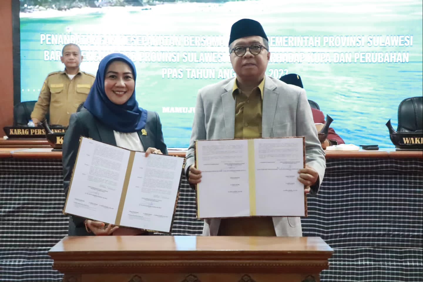 Mamuju,penasulbar.co.id –DPRD Sulbar menggelar Paripurna dalam rangka penandatangan nota kesepahaman Kebijakan Umum Perubahan APBD (KUPA) dan Prioritas Platform Anggaran Sementara (PPAS) Tahun Anggaran 2023, dan Penyampaian SK DPRD Sulbar terhadap penyempurnaan Ranperda Pertanggungjawaban Pelaksanaan APBD Tahun Anggaran 2022, di Kantor Sementara DPRD Sulbar, Senin malam 25 September 2023.