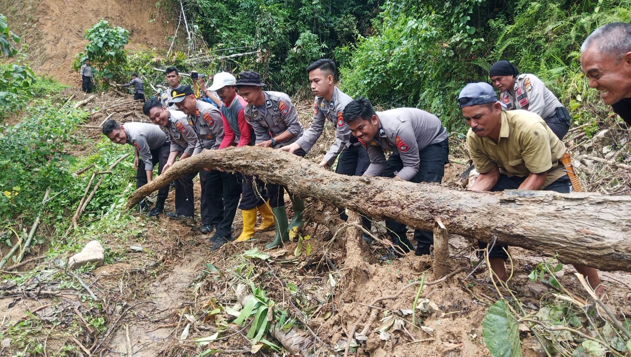 Mendengar kejadian tersebut, dengan sigap Kasat Sabhara Polres Polman IPTU Haris Yajji bersama personilnya menuju ke lokasi dan bersama-sama masyarakat setempat bergotong-royong membersihkan material longsor dengan menggunakan peralatan seadanya.