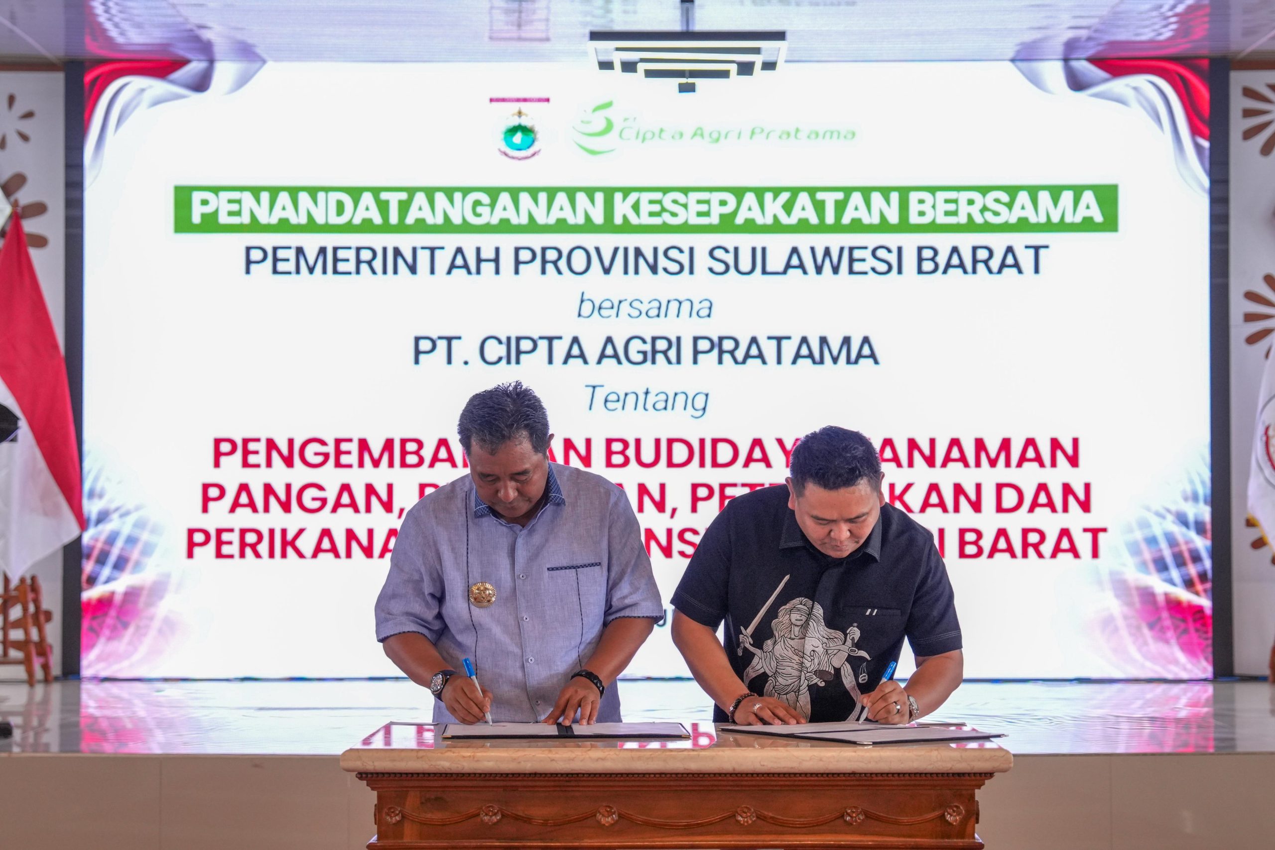Bertempat di di gedung graha sandeq Pemprov Sulbar, Sabtu, 8 Juni 2024. Pemerintah Provinsi (Pemprov) Sulbar dan PT Cipta Agri Pratama (CAP) melakukan penandatanganan kesepakatan bersama pengembangan budidaya tanaman pangan, pertanian, peternakan dan perikanan.