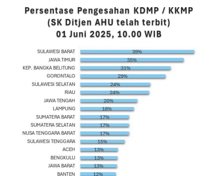 Mamuju,penasulbar.com – Direktorat Jenderal Administrasi Hukum umum (Ditjen AHU) Merilis data terkini sekira pukul 10.00 WIB, Minggu, 1 Juni 2025. Persentase pengesahan Koperasi Desa Kelurahan Merah Putih (KDMP) dan Koperasi Kelurahan Merah Putih (KKMP) menempatkan Provinsi Sulawesi Barat di peringkat pertama capaian pembentukan dan pengesahan Koperasi Desa Kelurahan Merah Putih.