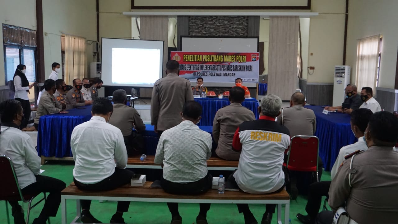 TIM Puslitbang POLRI Polman,penasulbar.co.id – Tim Pusat Penelitian dan Pengembangan (Puslitbang) Polri melaksanakan Penelitian tentang “Efektifitas Implementasi SOTK Pusinafis Bareskrim Polri di Kewilayahan” T.A. 2021 di wilayah Polda Sulawesi Barat salah satunya Polres Polewali Mandar, Senin (21/6/21).