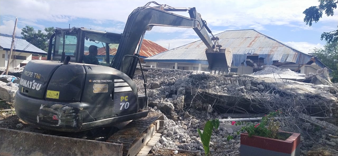 Personil Yonzikon 14/SWS sedang membersihkan reruntuhan Bangunan Masjid SMAN I Mamuju dengan menggunakan alat berat.
